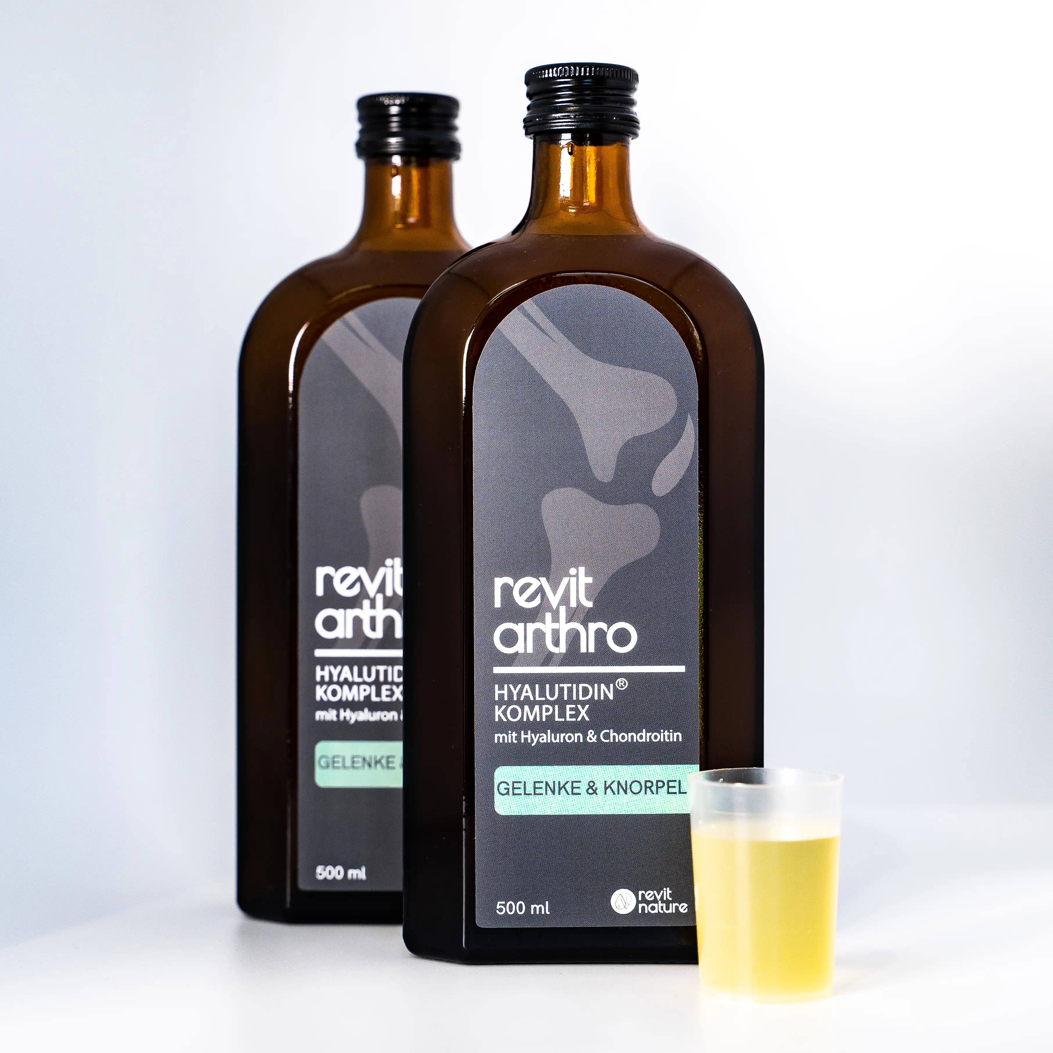 Revit Arthro Zero kombiniert Hyaluronsäure, Chondroitin und Hagebuttenextrakt in einer zuckerfreien Premium-Rezeptur.