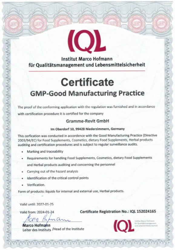 Unsere Produktionsprozesse und unsere Produkte werden regelmäßig von unabhängigen Institutionen kontrolliert. Sowohl unser Labor für die Entwicklung neuer Produkte als auch unsere Produktion erfüllen die GMP-Anforderungen bezüglich der guten Herstellungspraxis. Unter GMP (englisch Good Manufacturing Practice) versteht man Richtlinien zur Qualitätssicherung der Produktionsabläufe und der Produktionsräume bei der Produktion von Arzneimitteln und Wirkstoffen, aber auch bei Nahrungsergänzungsmitteln und Kosmetika.