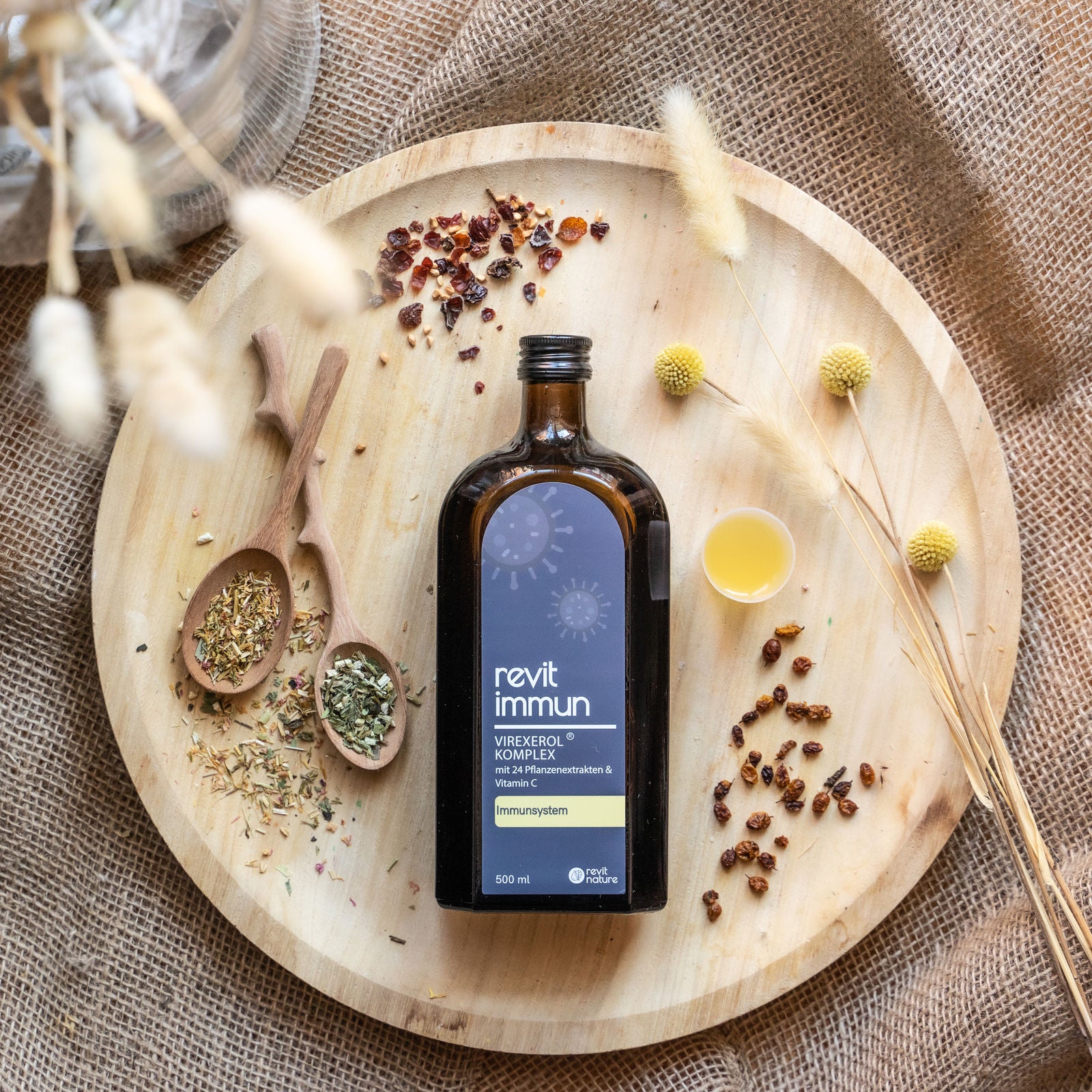 Mit REVIT IMMUN haben wir einen natürlichen Komplex entwickelt, der die Kraft von 24 sorgfältig ausgewählten Pflanzenextrakten mit Vitamin C vereint – für eine ausgewogene und hochwertige Rezeptur in flüssiger Form.